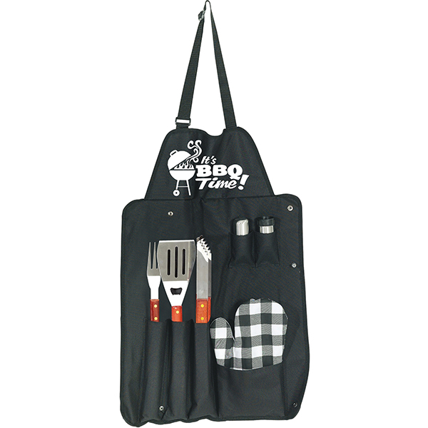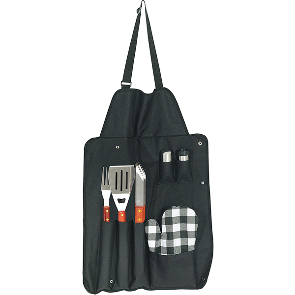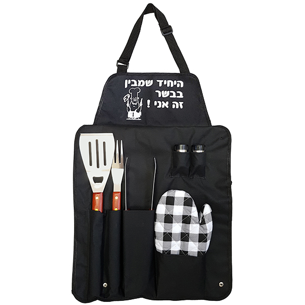 סט 7 כלים מושלם לברבקיו הכולל: סינר מקצועי, מזלג ענק, מחית, מלקחיים עשויים מתכת עם ידיות עץ לאחיזה נוחה מלחייה ופלפליה, כפפה מבודדת חום. מידות סינר: רוחב 42 ס'מ.